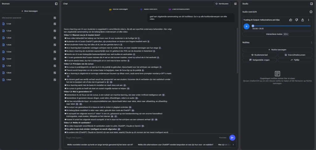 - Het generereren van een podcast duurt enkele minuten. Ondertussen kan je chatten met NotebookLM over het hoofdstuk. Begin met het vragen om een samenvatting.
